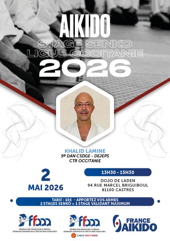 Stage Senko Ligue Occitanie le 2 mais 2026 de 13H30 à 15H30, animé par Khalid Lamine 5ème Dan, au dojo de Laden, 94 rue Marcel Briguiboul 81100 CASTRES.